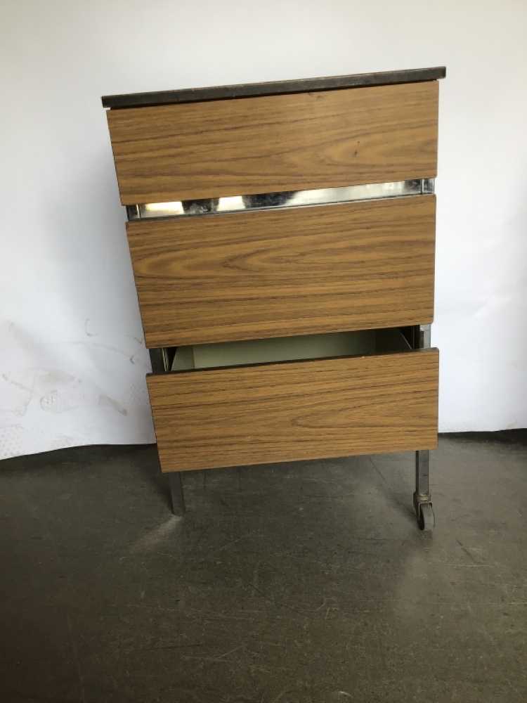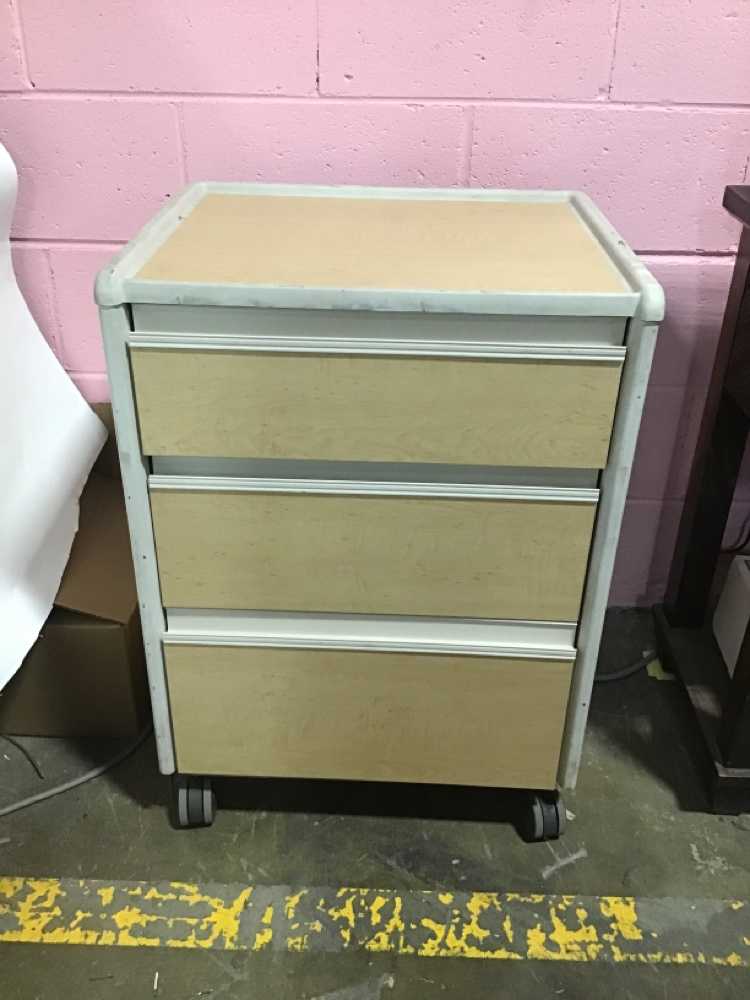 Hospital Side Table / Wood Grain Laminate / Rolling / 3 Drawers