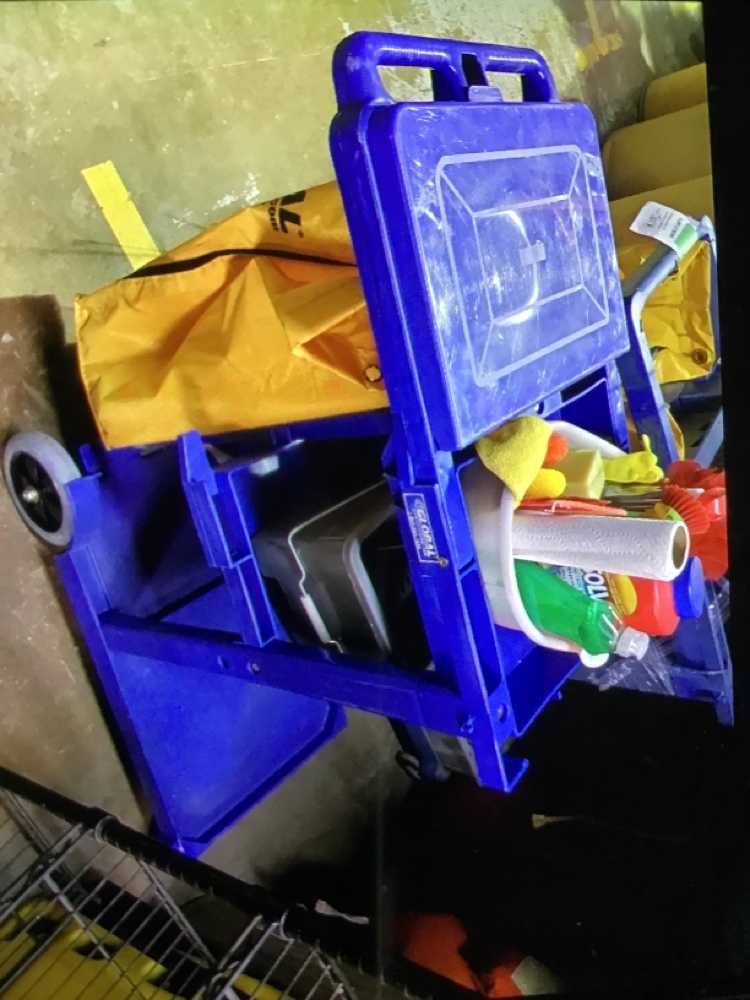 Rolling Blue Plastic Janitor Cart With [ Grey Bucket, Frosted Plastic Bucket, 1 Spray Bottle, Yellow Microfiber Towel 1 Pair If Yellow Rubber Gloves, Roll Of Paper Towels 1 Green Red Scrub Brush 3 Scrub Pads, 1 Bottle Of Dish Soap, 3 Cleaning Bottles, 1 Yellow Reusable Bag,