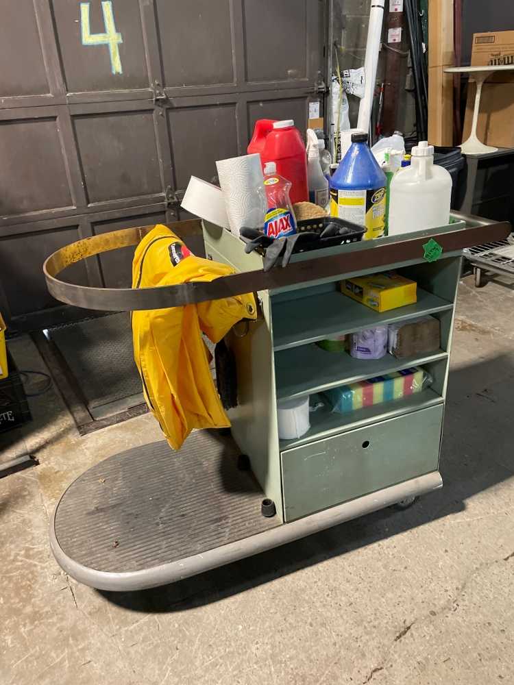 Black Plastic Rolling Cleaning Cart With [ Grey Plastic Garbage Can, 6 946ml Plastic Spray Bottles, 4 4L Plastic Cleaning Jug, 2 Grey Plastic Cleaning Caddies, 1 Wood Handle Toilet Brush, 3 Rolls Of Paper Towels 1 Roll Of Blue Shop Towls, 1 Red Metal Dust Pan, 1 Black Handle Scrub Brush, 1 Blue Plastic Handle Duster