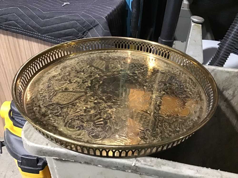 Brass Serving Tray With Perforated Sides And Carved Floral Design In Center