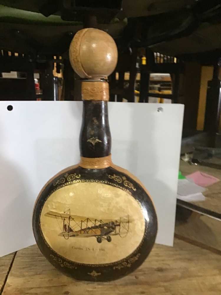 Beige Brown Vintage Decanter Wrapped In Leather With Picture Of Biplane
