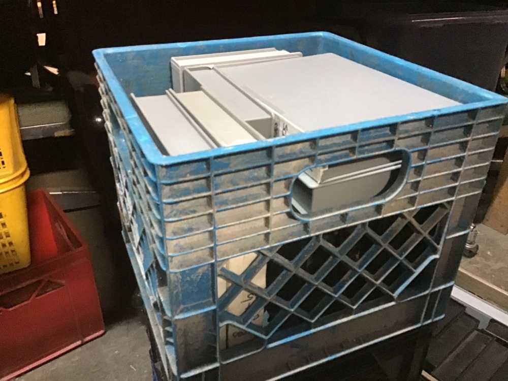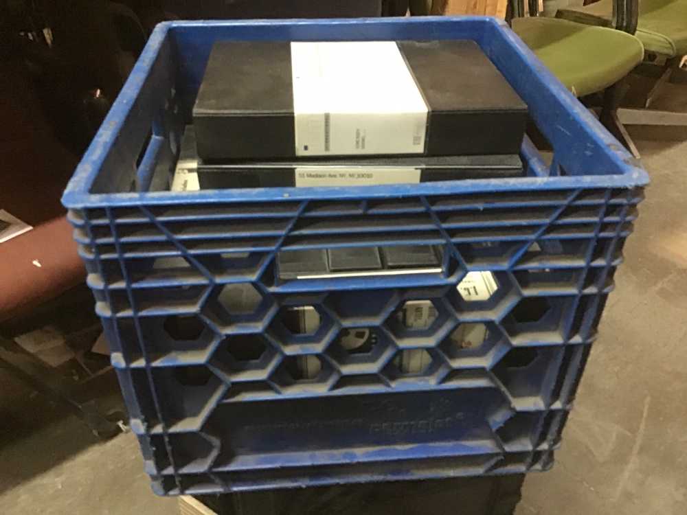 Blue Milk Crate With 12 Black/Grey Plastic News Reel Cases [ 7 With Tapes ]