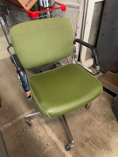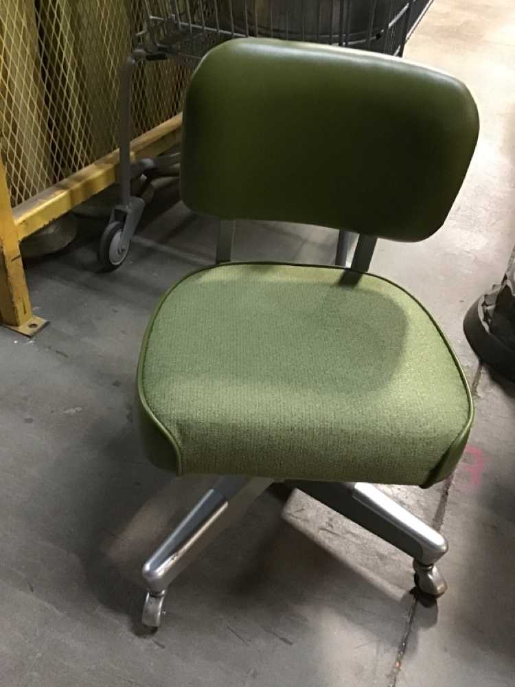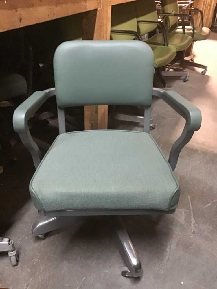 Grey Metal Framed Rolling Green Fabric Green Vinyl Steel Case Chair