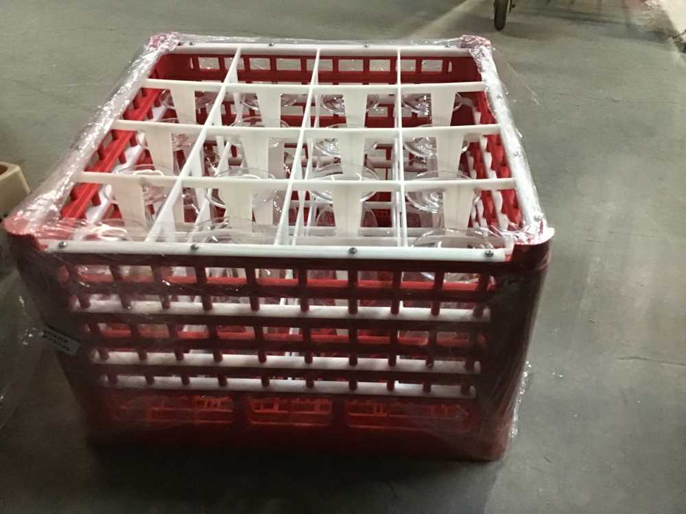 Red Plastic Dish Rack With 16 Crystal Wine Glasses