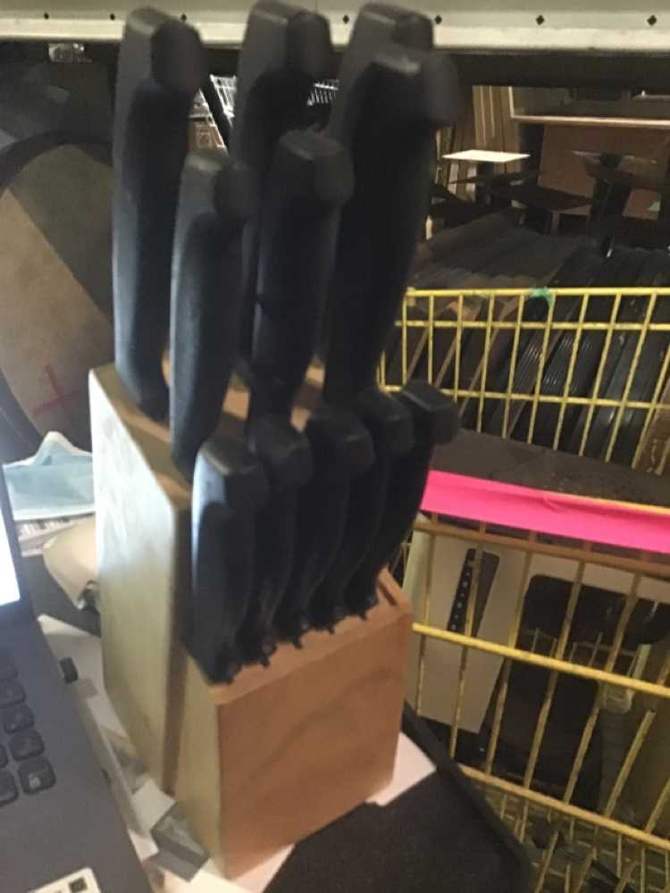Blond Wood Knife Block With 11 Black Handle Knives