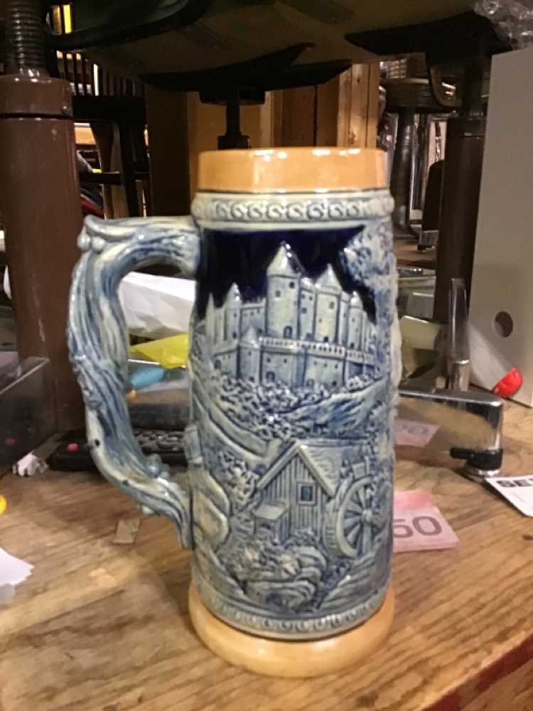 Blue Dark Blue Brown Ceramic Beer Stein With Castle And Barn