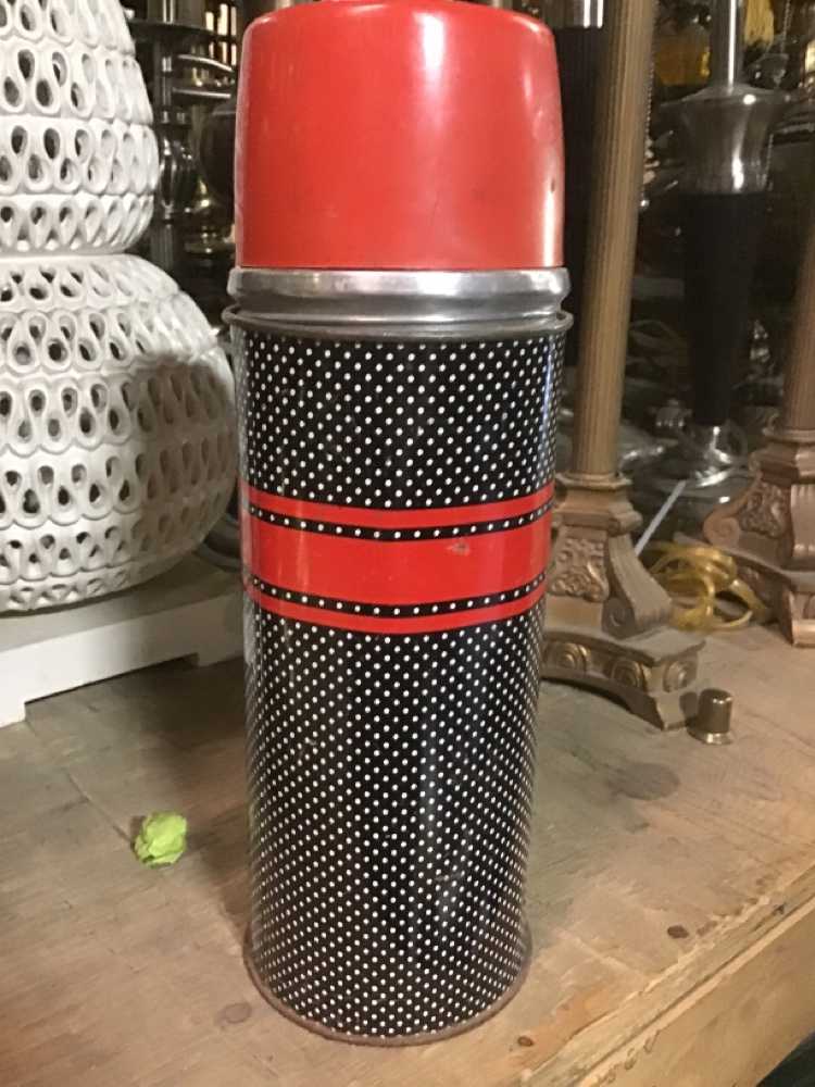 Black Metal Thermos With Red Stripes White Dots And Red Lid
