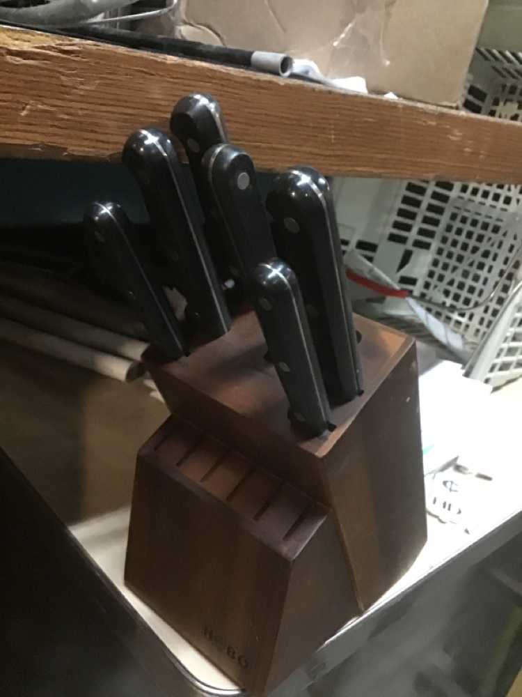 Brown Wood Knife Block With 6 Black Handle Knives
