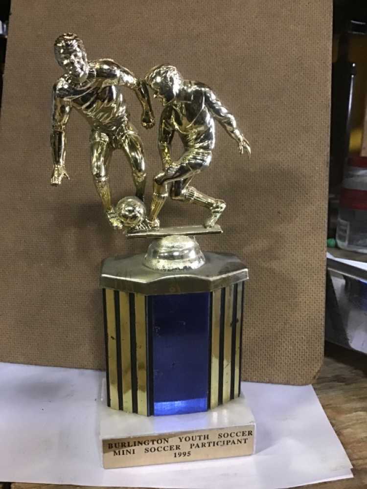 Blue Gold Plastic Soccer Trophy With Women Player On Top