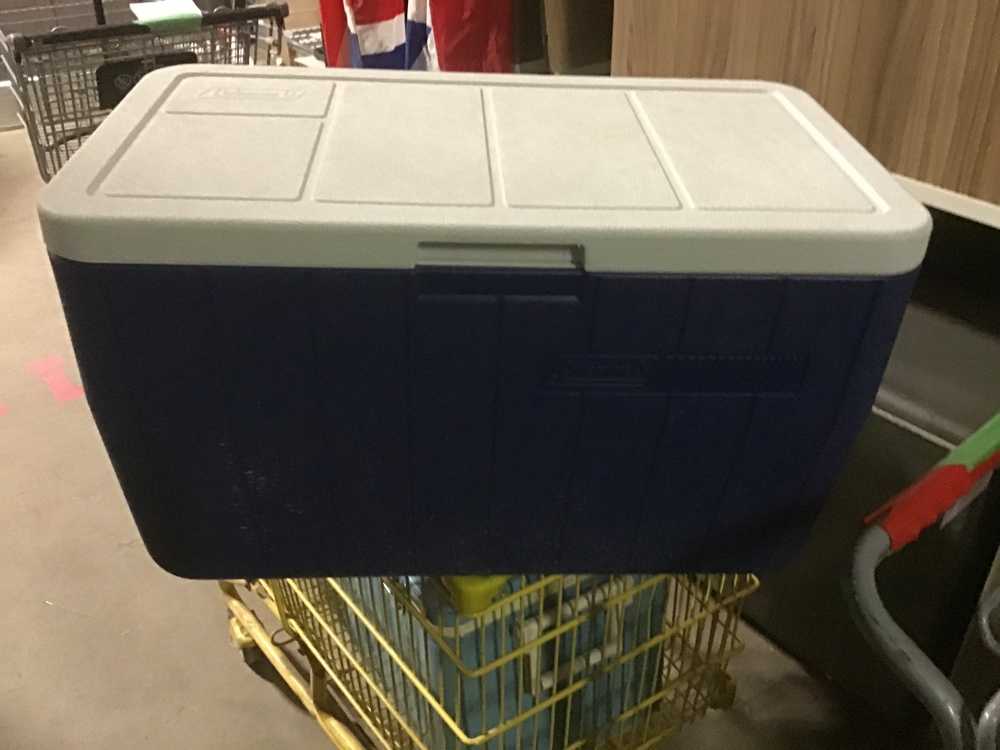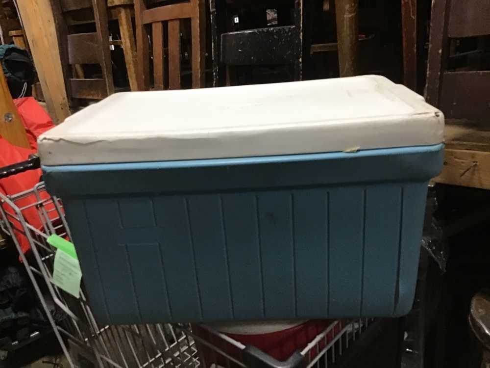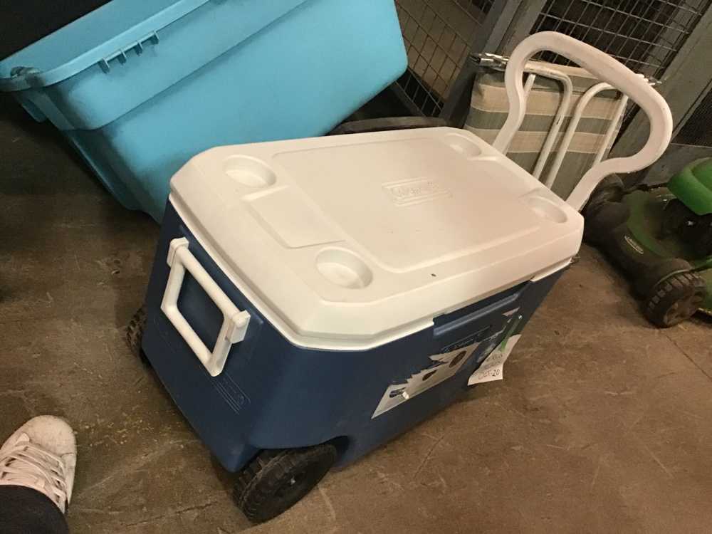 Blue White Plastic Cooler With 2 Wheels And Handle