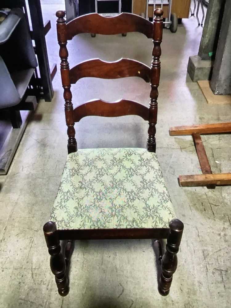 / Vintage Brown Ladder Back Dining Chair With Grey Beige Fabric Seat